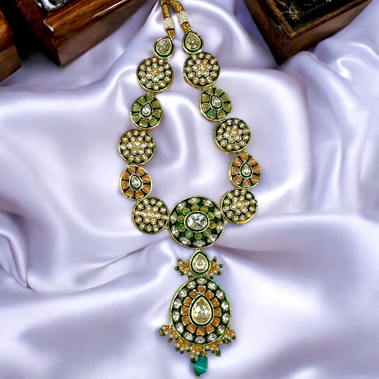 Introducing our stunning Kundan Necklace Set with a moissanite diamond setting, a masterpiece of elegance and refinement.